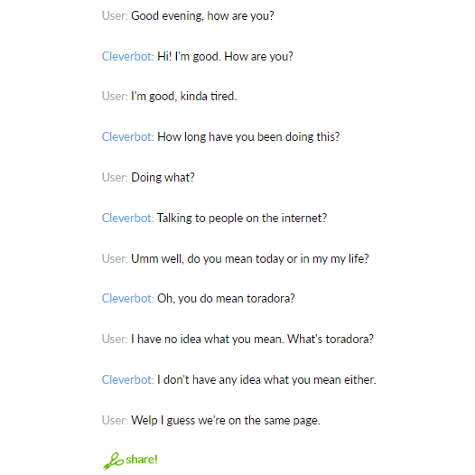 Some members of the team clearly think this is a waste of time and that AI can’t be trusted. It’s true that you have to be careful. For one, AI is only as good as the data it’s trained on. Does anyone remember Cleverbot? It’s a chatbot that, well, chats. Wikipedia says it came out in 2008, which sounds about right for the level of weird I remember being when I used it. It was fun to goof around and say weird things to see its response.